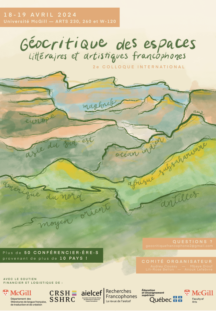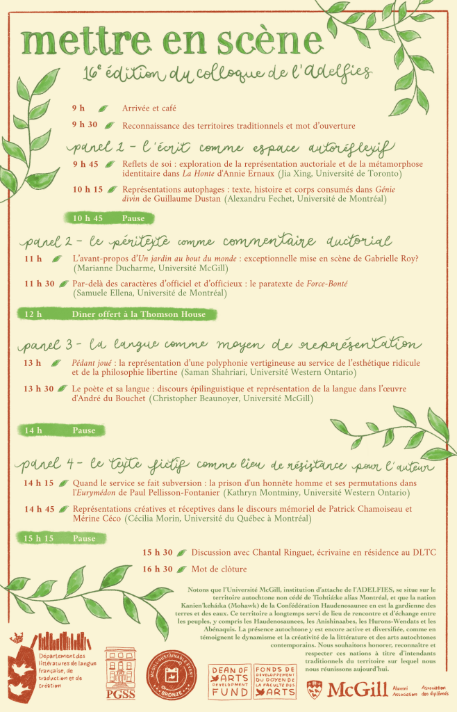 illustration d’une affiche et d’un programme pour le 16e colloque annuel de l’Association des étudiant·e·s en langue et littérature françaises inscrit·e·s aux études supérieures de l’Université McGill (ADELFIES) / Montréal, 2024