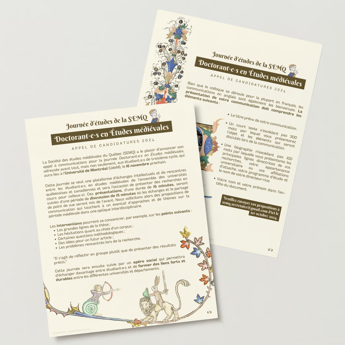 mise en page d’un appel à candidatures pour cet événement organisé par la Société des études médiévales du Québec (SEMQ) / Montréal, 2024